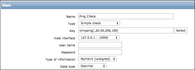 Let's create another passive item to check for the remote host. Go to Configuration | Hosts, click on Items next to the host you just created, click on the Create item button, and fill in these values: