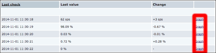 That's better; Zabbix now automatically calculates the change between every two checks (that's what the delta is for) and stores it, but the values still don't seem to be too user friendly. Maybe they're better in the graph—let's click on the Graph link to find out: