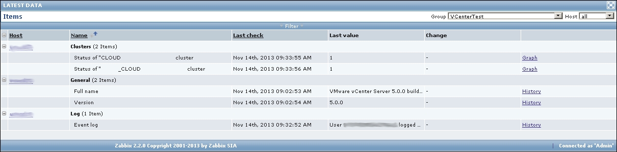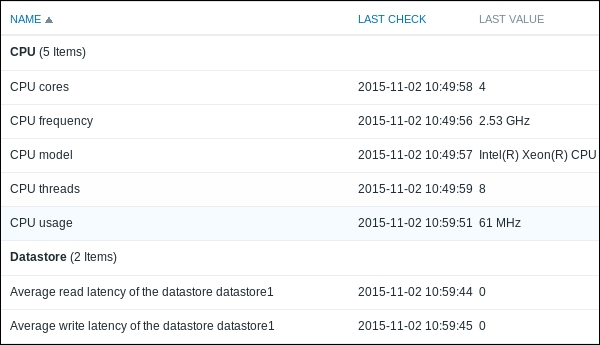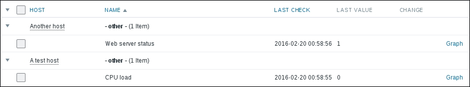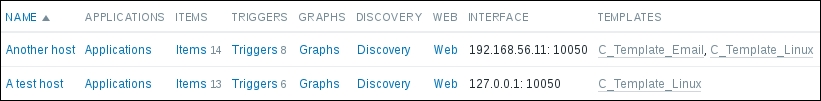 We should see two monitored hosts now, each having a single item: