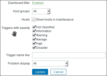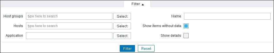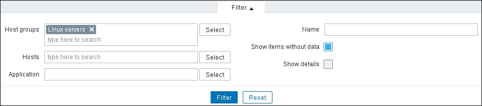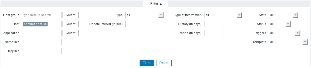 This area provides quick and useful information about the currently selected host: the hostname, whether the host is monitored, and its availability. Even more importantly, on the right-hand side, it provides quick shortcuts back to the host list and other elements associated with the current host: applications, items, triggers, graphs, discovery rules, and web scenarios. This is a handy way to switch between element categories for a single host without going through the host list all the time. But that's not all yet—click on the Filter button to open the filter we got thrown in our face before. The sophisticated filter appears again: