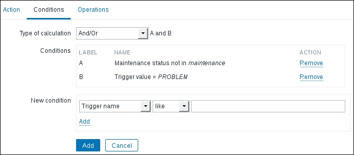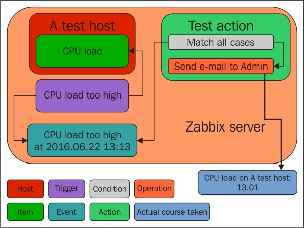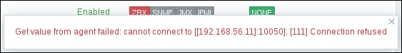 If you see an error message similar to Get value from agent failed: cannot connect to [[192.168.56.11]:10050]: [111] Connection refused (most likely with a different IP address), it means that the Zabbix server was unable to connect to the agent daemon port. This can happen because of a variety of reasons, the most common being a firewall—either a network one between the Zabbix server and the remote host or a local one on the remote host. Make sure to allow connections from the Zabbix server to the monitored machine on port 10050.