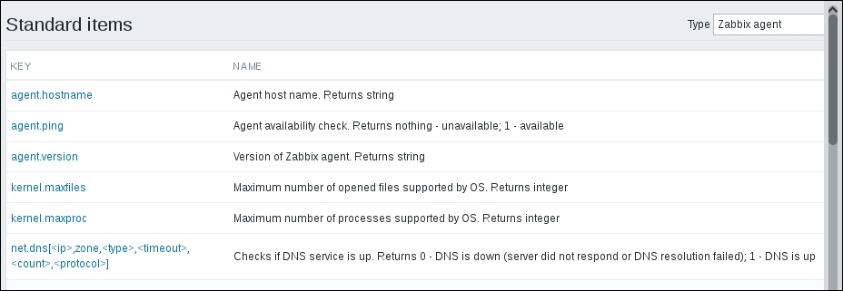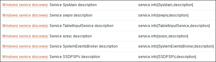 The Type dropdown in the upper-right corner will allow you to switch between several item types—we'll discuss the other types later. For now, find net.tcp.service in the list and look at the description. There are two things to learn here: firstly, we didn't actually have to add that 80—it's a port, and given that the default already is 80, adding it was redundant. However, it is useful if you have a service running on a nonstandard port. Secondly, there's a key list just one click away to give you a quick hint in case you have forgotten a particular key or what its parameters should be like.