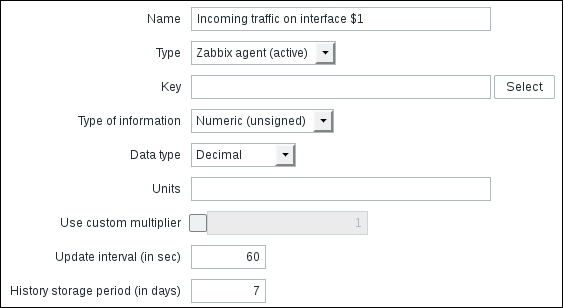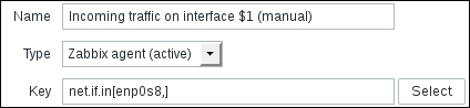 We'll do something different with the Key field this time. Click on the Select button, and in the upcoming dialog that we saw before, click on net.if.in[if,<mode>]. This will fill in the chosen string, as follows: