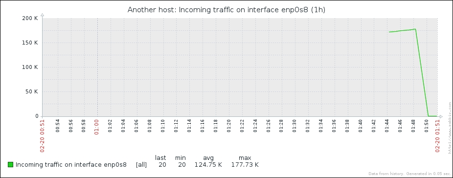 Wonderful; data is still arriving. Even better, notice how Zabbix now automatically calculates KB, MB, and so on where appropriate. Well, it would in our example host if there were more traffic. Let's look at the network traffic; click on Graph: