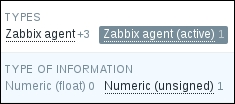 The entries in the subfilter work like toggles—if we switch one on, it works as a filter on the data in addition to all other toggled subfilter controls. Let's click on Zabbix agent (active) now. Notice how the item list now contains only one item—this is what the number 1 represented next to this Subfilter toggle. But the subfilter itself now also looks different: