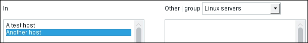 Using this filter, we can make complex rules about what items to display. Looking at the top-left corner of the filter, we can see that we are not limited to viewing items from a single host; we can also choose a Host group. When we need to, we can make filter choices and click on the Filter link underneath. Currently, it has only one condition: the Host field contains Another host, so the Items link from the host list we used was the one that set this filter. Clear out the Host field, choose Linux servers from the Host group field, and click on the Filter button below the filter.