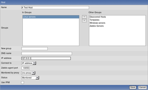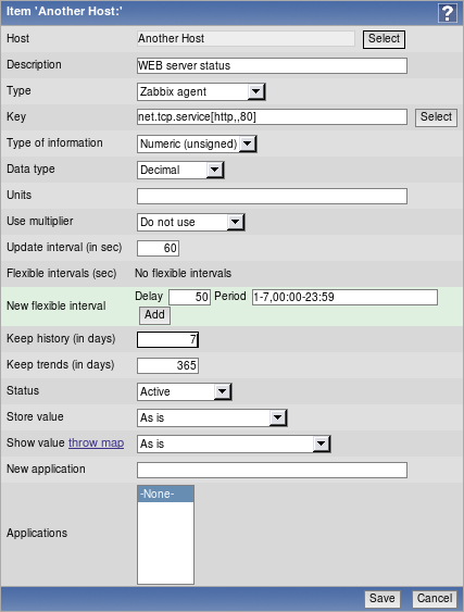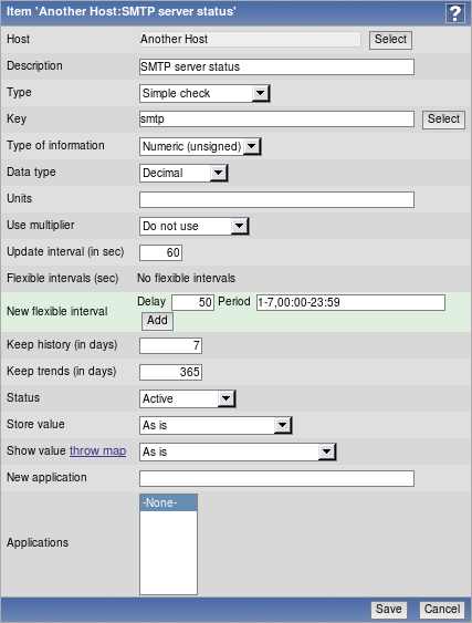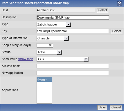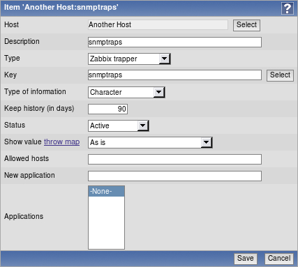 Open Configuration | Hosts, click on Items next to Another Host and click Create Item. For now, fill in these values:
