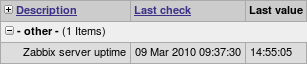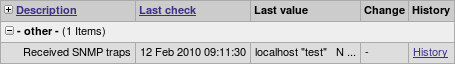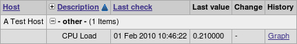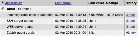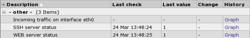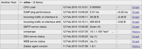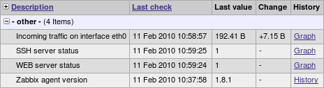If you don't see the data, wait a while, it should appear eventually. When it does, you should see the version of the Zabbix agent installed on the remote machine listed and it might be a higher number than displayed here, as new versions of Zabbix have probably been released. Notice one minor difference while all the items we added previously have links named Graph in the History column, the last one has History. The reason is simple, for textual items graphs can't be drawn so Zabbix does not even attempt to do that.