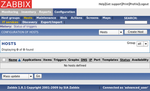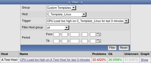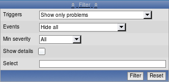 This area provides quick useful information about currently selected host hostname, DNS, IP, configured Zabbix agent port and whether the host is monitored and available. What's even more important, on the left hand side it provides quick shortcuts back to the host list and other elements, associated with current host applications, triggers and graphs. This is a handy way to switch between element categories for a single host without going through the host list all the time. But that's not all yet click on Filter link just above this status bar. A sophisticated filter appears.