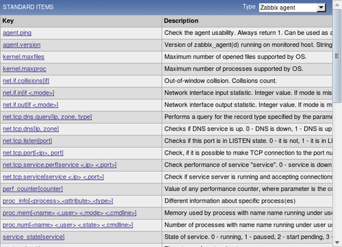 The last service is a bit special in its own way. While others perform service-specific checks, TCP just checks the TCP connection. It's closer to a key you can see a couple of rows above in the itemlist, net.tcp.port. As the description says, this one just tries to open TCP connection to any arbitrary port without performing any service-specific checks on the returned value. If you try to use an arbitrary service string that is not supported, you would simply get an error message saying Not supported by Zabbix agent.