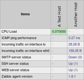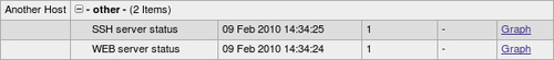 That's all we have to do this time, so click Save again. This time, item should be added successfully. Now navigate to Monitoring | Latest data, where Another Host should have two items listed, SSH server status and WEB server status. Their status would depend on what services are running on the remote host. As it's remote, SSH most likely is running (and thus having a value of 1), but whether or not the web server is running would be specific to your situation.