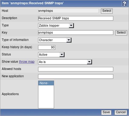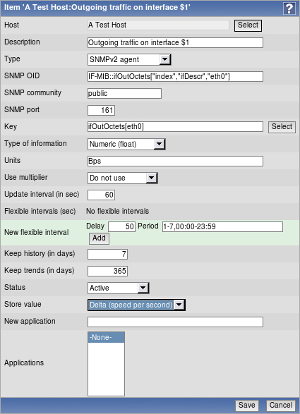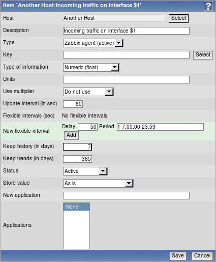 Replace the content in the square brackets with eth0, so that the field contents read net.if.in[eth0]. When done, click Save.