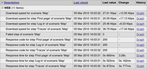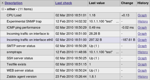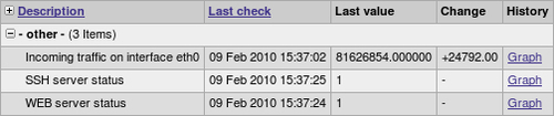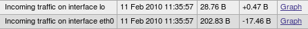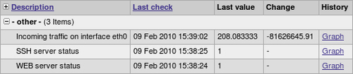 That's better, Zabbix now automatically calculates the change between every two checks (that's what delta is for) and stores that, but the values still don't seem to be too user friendly. Maybe they're better in the graph let's click on the Graph link to find out.