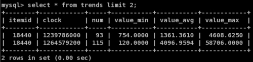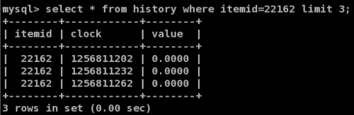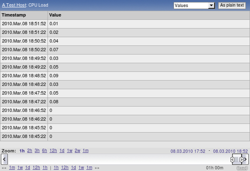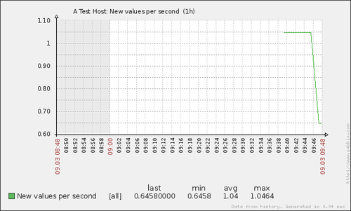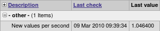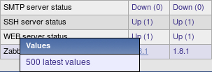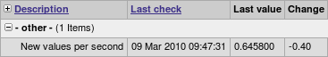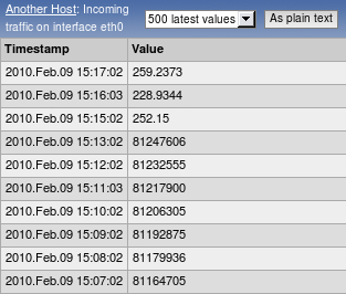Ouch. While we can clearly see the effect our change had, it also has left us with a very ugly historical data. The upper part of that graph represents total counter (thus showing total since the monitored system was started up), but the lower part represents correct (delta) data. You can also take a look at values numerically - see the dropdown at the upper-right corner, which reads Graph currently. Choose 500 latest values in there.