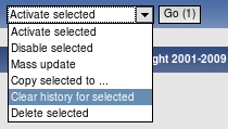 The second entry from the bottom; named Clear history for selected probably does what we want, so select it. Notice the Go button next to the activity selection it shows the amount of entries selected, so we always know on how many elements we are operating on. Click this button. You should get a JavaScript pop up, asking for confirmation to continue. While history cleaning can take a long time with large datasets, in our case, it should be nearly instant, so click the OK button to continue. This should get rid of all history values for this item, including the huge ones.