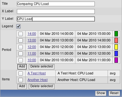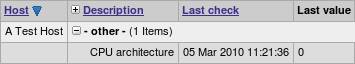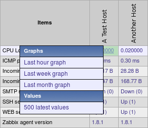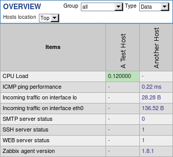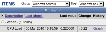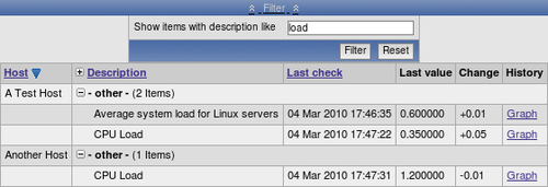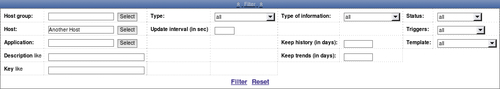 Using this filter, we can make complex rules on what items to display. Looking at the left top corner of the filter, we can see that we are not limited to viewing items from a single host we can also choose a hostgroup. When needed, we would make filter choices and click on the Filter link below. Currently it has only one condition field Host contains Another Host, so Items link from the host list we used was the one which set this filter.