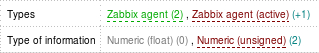 The entries in the subfilter work like toggles if we switch one on, it works as a filter on the data in addition to all other toggled subfilter controls. Let's click on Zabbix agent now. Notice how item list now contains two items only that's what number 2 represented next to this subfilter toggle. But the subfilter itself now also looks different.