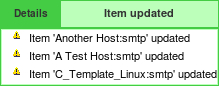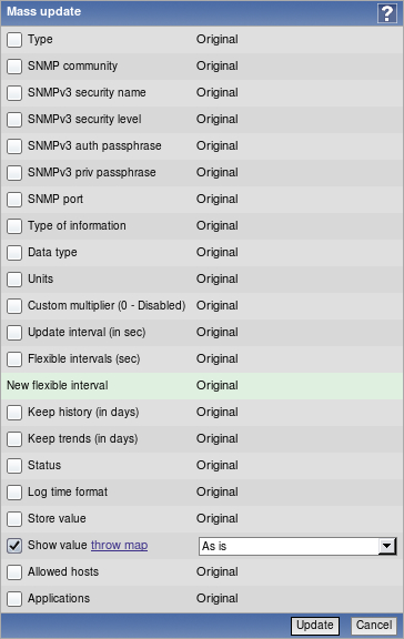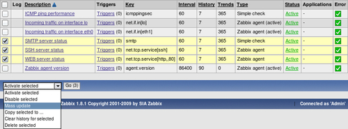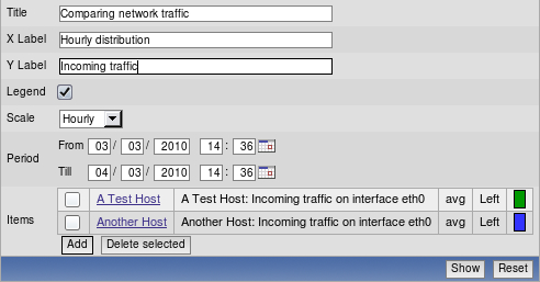In this list, we can nicely see the change in data representation, as well as the exact time when the change was performed. But those huge values have come from the counter data, and they pollute our nice, clean graph by being so much out of scale we have to get rid of them. Open Configuration | Hosts and click on Items next to Another Host, then mark the checkbox next to Incoming traffic on interface eth0 item and look at the activity dropdown positioned at the bottom of the itemlist.