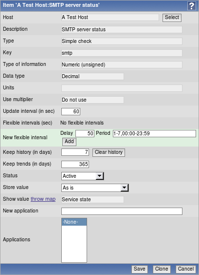 Let's try to monitor another service now; for example, the one running on port 22, SSH. To keep things simple for us, we won't create an item from scratch instead, go back to Configuration | Hosts, click on Items next to Another Host and click on link WEB server status in the Description column. This will open item editing screen, showing all the values we entered before. Notice how this time there are more buttons available at the bottom. Along with the Save and Cancel buttons we also have Delete, which obviously, deletes the currently open item. We don't want to do that now. Instead, click Clone.